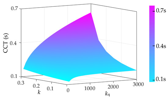 By adopting the above numerical and iterative calculation methods, the CCTs of the droop-controlled inverter, for different active-frequency droop coefficients (kp), reactive-voltage droop coefficients (kq), and grid voltage droop coefficients (k), are shown in Figure 7.