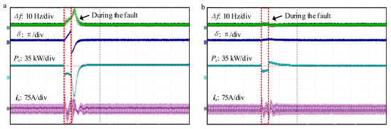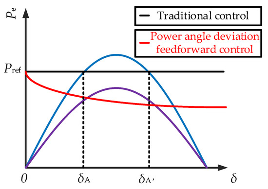 As shown in Figure 9, during the fault, the droop-controlled inverter under conventional control will experience transient instability. For the droop-controlled inverter with the addition of the power angle deviation feedforward control, its equivalent active-power command value (Pref − K1(δ − δN)) decreases. If K1 is reasonably selected, the equivalent active-power command value of the droop-controlled inverter’s power angle curve will intersect with its output active power; at this point, the droop-controlled inverter transitions from transient instability to transient stability.