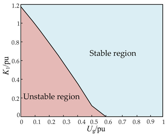 As shown in Figure 9, the blue curve represents the power angle curve of the droop-controlled inverter before the fault, while the purple curve denotes that after the fault occurs. By determining the power angle (δmax) corresponding to the maximum active power output of the droop-controlled inverter during a fault, if the condition Pref − K1(δmax − δN) is satisfied at this point, there will be at least one intersection between the equivalent active-power command value and the output active power. From this condition, the value of K1 can be derived, and the relationship between the grid fault voltage (UgF) and K1 is plotted in Figure 10. All the K1 values within the stable region can ensure the stability of the droop-controlled inverter during the corresponding grid fault. It can be observed that when kq = 800, the droop-controlled inverter will not undergo transient instability as long as the grid voltage dips to 0.6 pu or higher.