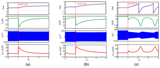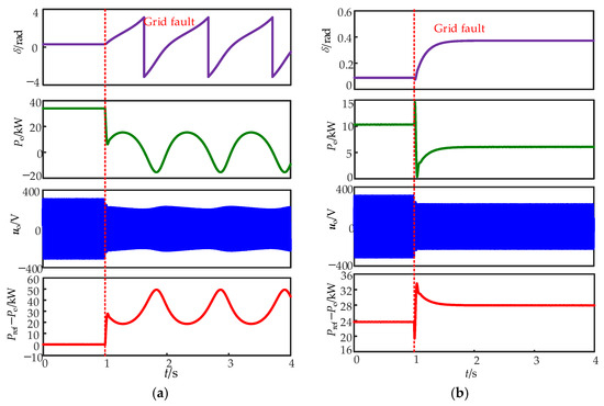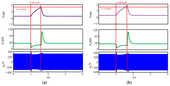 To ensure the accuracy and efficiency of the simulation, the key parameters of the MATLAB/SIMULINK model are configured as follows: a step size of 5 × 10−6, a converter-switching frequency of 10 kHz, and the ode45 solver (a variable-step explicit Runge–Kutta solver commonly used for transient analysis) are adopted to solve the system’s differential equations. The first scenario tests the performance of the droop-controlled inverter when the grid voltage drops to 0.30 pu at 1.0 s. The impacts of the different control parameters on the transient stability of the droop-controlled inverter are illustrated in Figure 11. From the analysis in Section 4, the CCA and CCT of the droop-controlled inverter under this condition are 2.70 rad and 0.51 s, respectively. To verify the correctness of the calculated transient stability boundary of the droop-controlled inverter, the fault durations set in the simulation are 0.5 s and 0.53 s. As shown in Figure 11a, when the fault duration is 0.5 s, the power angle reaches 2.52 rad; since the fault is cleared within the transient stability boundary, the droop-controlled inverter achieves transient stability after the fault is removed. Figure 11b shows that when the fault duration is 0.53 s, the power angle reaches 2.73 rad. As the fault is cleared after exceeding the transient stability boundary, the droop-controlled inverter loses transient stability after the fault. These simulation results confirm the correctness of the transient stability boundary analyzed in Section 4.