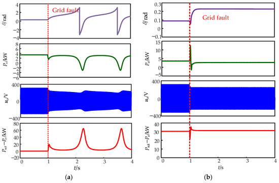 Simulation results of the droop inverter for the grid voltage dropping to 0.30 pu: (a) traditional control; (b) power angle deviation feedforward control.