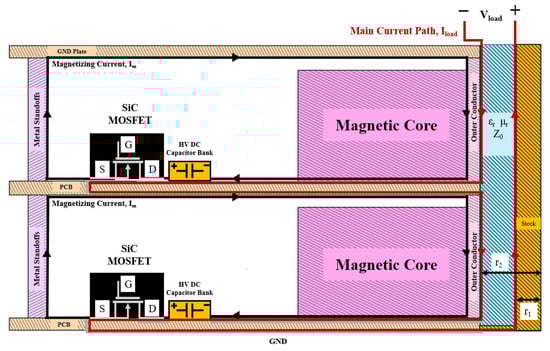 Figure 1 shows the magnetizing current and the main current paths in a simplified 2-stage LTD. The magnetic core acts as a choke, suppressing the current in the inner loop, the magnetization current. The current in this inner loop is not transferred to the load and is a source of losses in this system, highlighting the necessity of high-performance magnetic cores for high efficiency. When the core is driven into saturation, almost all current will take the same path as the magnetization current, and the load current will be small. In addition to the current loops depicted in Figure 1, the transmission line is depicted with a coaxial geometry consisting of an inner and outer conductor with a dielectric in between. Equation (2) gives an expression for the characteristic impedance of this transmission line.