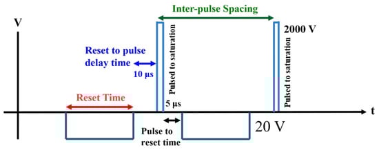Visual representation of the timing sequence used in the pulsed reset evaluation, where the reset pulse is opposite polarity of the applied voltage. The inter-pulse spacing is varied, affecting the reset time. Other delay times are held constant throughout.