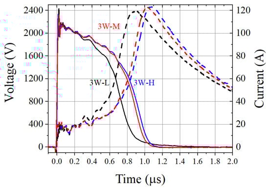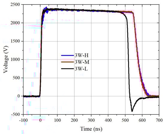 Following individual characterization, the cores were integrated into the LTD system to evaluate their influence on overall performance, including rise-time, output pulse shape, and system efficiency under practical operating conditions. A statistical comparison based on 100 shots with a 50 load was used to assess each core’s average voltage amplitude during the pulse flat-top and its rise-time, revealing negligible differences. Representative waveforms at 2.4 kV for each core, shown in Figure 9, illustrate nearly identical profiles. The only notable distinction is that the 3W-L core saturates earlier due to its lower available flux swing for a given reset current.