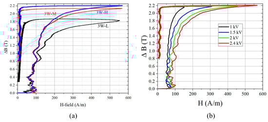 Experimentally measured B-H curves of the MK cores with a continuous DC reset current of 4 A. (a) Comparison of MK cores with 2 kV charge voltage. The 3W-H achieves the highest flux at 2.25 T, while the 3W-L only reaches 1.85 T. (b) 3W-H magnetic core B-H curve widening with increasing pulse voltage with a continuous DC reset current of 4 A.