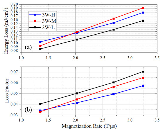 At the upper end of the magnetization rates of interest, the 3W-L material has the lowest energy losses, followed by the 3W-H, with 3W-M being the most lossy; see Figure 7a. However, considering the loss factor, the 3W-H outperforms the other two cores; see Figure 7b.