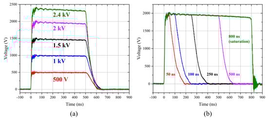 Single-stage LTD output waveforms with a 6 mm (1/4 in.) stalk with PTFE insulation and a 25 V gate voltage. (a) Varying charge voltages into a 50 load with a pulse width of 500 ns. (b) Varying pulse widths into a 50 load with 2 kV charge voltage.