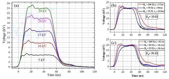 The impact of transmission line impedance on voltage waveform shape and rise-time was examined for three different stalk characteristic impedances, 6 , 23 , and 51 , as shown in Figure 13b,c. An output voltage of 20 kV with a load resistance of 25 resulted in a peak current of approximately 800 A; see Figure 13b,c. Although not explicitly shown, under similar testing conditions with an increased charge voltage, an output voltage of 24 kV into the same load produced a peak current of approximately 1 kA. In Figure 13b, a sweep of load resistances with reveals that the 100 load produces a noticeable voltage overshoot at the front of the pulse, while the 25 load does not. This overshoot is likely caused by the impedance mismatch between the characteristic impedance of the center stalk, , and the load. The similarities in voltage waveforms for the , and , configurations shown in Figure 13b,c, both with approximately , support this claim.