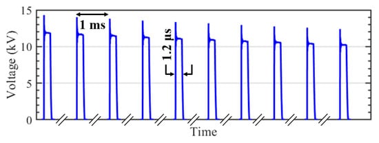 The LTD was charged to 1.2 kV, with each pulse having a pulse width of 1 s, correlating to a flux swing of approximately 1.8 T. Based on previous results outlined in Section 3.1, the minimum inter-pulse spacing that should be expected would be around 300 s, correlating to a pulse repetition frequency of 3.3 kHz. Figure 14 shows an example voltage waveform from a 10 shot burst with a charge voltage of 1.2 kV and an inter-pulse spacing of 1 ms.