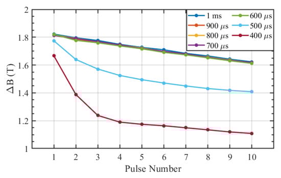 The observed pulse-to-pulse droop is due to the limited capacitor charging speed and could be overcome or minimized with a more aggressive charging scheme. As discussed previously, the voltage decay on each pulse is due to the losses in the magnetic core and the inability to recharge the energy storage capacitors to the target voltage between pulses. Figure 15 depicts the flux swing of each core of the LTD across the 10 shots in the burst across a range of inter-pulse spacings. The top grouping consisting of the 1 ms–600 s inter-pulse spacings experience some reduction in flux swing as the pulse number increases, associated with the energy loss in the cores. The reduction in flux swing observed in the 500 s and 400 s inter-pulse spacing tests was significantly more rapid in the initial pulses, indicating saturation of the magnetic cores.