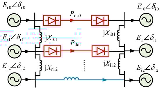 In this figure, represents the active power transmitted by the -th AC line in the AC channel. is the power transmitted by the -th DC line. , represent the electromotive forces and power angles of the systems at both ends of the -th transmission line. denote the tie reactances between transmission lines.