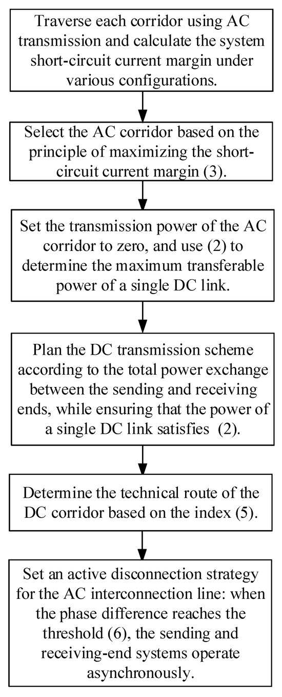 In the eastern developed provinces of China, power loads are highly concentrated and the grid structure is complex [1]. With the increasing integration of DC infeed and renewable energy, the tightly interconnected provincial power grids are facing challenges such as difficulties in power flow control and excessive short-circuit currents [2,3], while the scale effect of AC grid development has approached saturation. To enhance the controllability and flexibility of provincial backbone grids, embedding DC systems into the main grid has emerged as a promising technical route [4]. DC systems offer fully controllable power transmission and contribute almost no short-circuit current [5]; therefore, constructing new AC/DC hybrid grid structures with the aid of DC systems is expected to address the challenges of power flow control and short-circuit current exceeding limits in load center areas. As a result, AC/DC hybrid grid structures have recently gained wide attention from both academia and industry, with pioneering applications in Jiangsu and Guangdong [6,7]. However, the existing AC/DC hybrid grid structures are still at an early stage of development. With the continuous improvement of the economy, the challenges of short-circuit current control and power flow regulation in load centers will further intensify, and the proportion and role of DC in backbone grids will significantly increase. Therefore, it is urgent to investigate rational approaches for AC/DC hybrid interconnection to address grid construction challenges in load centers while minimizing potential adverse impacts on the system.