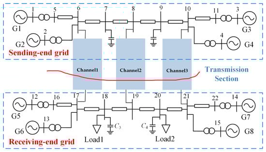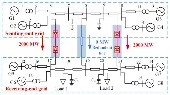 A typical single-AC multi-DC case is constructed using the IEEE two-area four-machine system. Specifically, two IEEE two-area four-machine systems are interconnected through three transmission channels, as shown in Figure 3. The load levels of the sending and receiving-end systems are adjusted so that the exchanged power between the two systems reaches 4000 MW. First, the location of the AC channel needs to be determined based on the system short-circuit current margin. With the transmission distance and AC line reactance parameters fixed, each transmission channel is traversed using the AC interconnection scheme, and the minimum short-circuit current margin of the system under different schemes is obtained, as shown in Table 1.