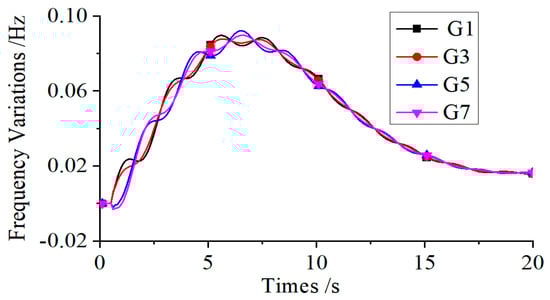 Next, the impact of AC interconnection line faults between the sending and receiving-end systems on system frequency stability is examined. A three-phase metallic short-circuit fault is applied to the AC interconnection line at 0.5 s and lasts for 0.1 s, after which the AC line is disconnected and the short-circuit fault is cleared. The resulting frequency variations in the generators are shown in Figure 7. As seen in Figure 7, during the short-circuit fault, the frequencies of all generators rise rapidly. Once the fault is cleared, the frequencies gradually decrease and eventually return to their nominal values. It is worth noting that the process shown in Figure 7 reflects the primary frequency response caused by the temporary obstruction of power delivery to the generators due to the short-circuit fault.