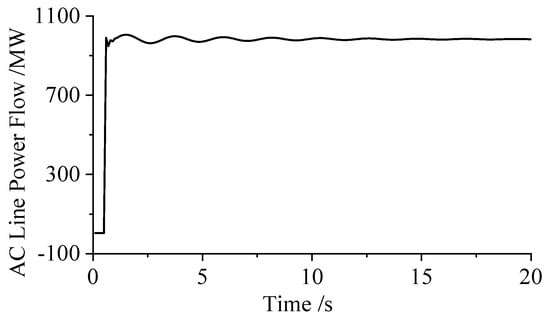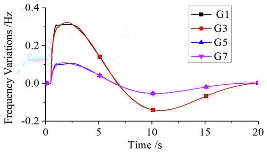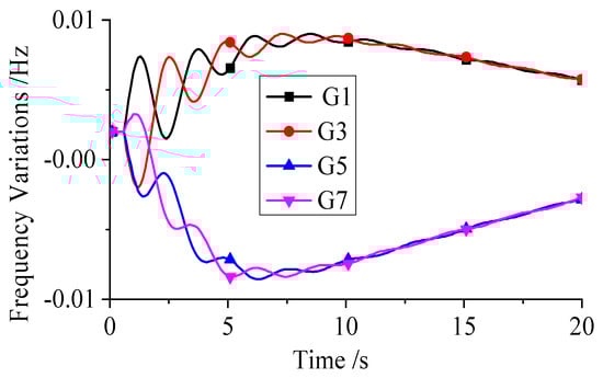 To illustrate this, the AC interconnection line is disconnected without introducing a short-circuit fault, and the generator frequency variations are shown in Figure 8. From Figure 8, it can be seen that, in the absence of a short-circuit fault, opening the AC interconnection line has negligible effect on the frequencies of the generators, because under steady-state conditions the AC line does not carry significant power.