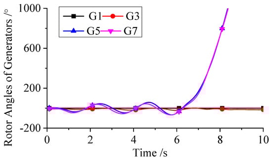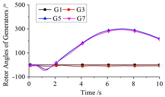 The feasibility of the single-AC multi-DC interconnected scheme is analyzed from the perspective of synchronous stability. Compared with a fully AC synchronous interconnection scheme, the AC coupling between the sending and receiving systems is weakened under the single-AC multi-DC scheme, which can lead to a deterioration of system synchronous stability if no countermeasures are taken. A short-circuit fault is applied on the line between bus 6 and bus 7 in the sending-end system and cleared after 0.1 s. The rotor angle responses of all units in the system are shown in Figure 9. As seen in Figure 9, without any mitigating measures, the short-circuit fault causes the units in the sending and receiving systems to lose synchronism, with the phase difference continuously increasing. Ultimately, the units lose synchrony, and the system’s synchronous stability cannot meet the requirements for stable operation.