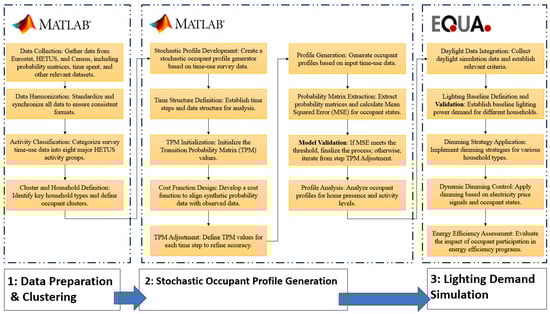 Key household types are identified to define occupant clusters. The process continues with stochastic occupant profile generation, where a profile generator is developed based on time-use survey data (Section 2 in Figure 1). The time structure and steps for analysis are established, and the Transition Probability Matrix (TPM) is initialized. A cost function is designed to align synthetic probability data with observed data, and TPM values are iteratively refined to improve accuracy. Occupant profiles are generated, and probability matrices are extracted to calculate Mean Squared Error (MSE). If the MSE meets the required threshold, the process concludes; otherwise, the loop continues with further TPM adjustments until validation is achieved. The final phase involves modelling lighting and energy efficiency measures (Section 3 in Figure 1). Daylight data is integrated, and baseline lighting demand is defined for different household types. Dimming strategies are implemented based on household characteristics and dynamic electricity price signals (see Section 3.4). The methodology concludes with an assessment of energy efficiency, evaluating the impact of occupant participation in energy-saving programs. As shown in Figure 1, Sections 1 and 2 have been conducted in MATLAB [51], and we have used IDA ICE (EQUA) [52] for Section 3.