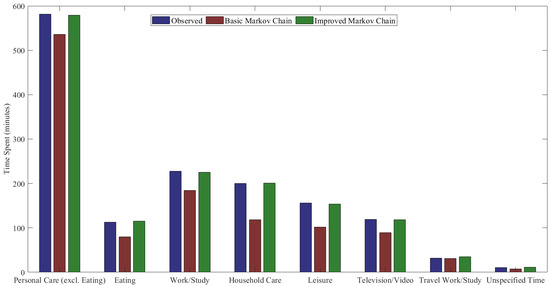 HETUS classifies daily activities into broad themes like personal care, work, household tasks, and leisure, ensuring consistency across datasets (see Table S2) [5,48]. For example, the bulk activities category includes essential activities like “Sleeping” (AC01) and “Personal grooming” (AC0). In the household and family care category, activities like “Dishwashing” (AC31A), “Ironing” (AC331), and “Childcare” comprise (AC38A, AC38B) [5]. Each of the categories in the high-level taxonomy is made such that it groups activities meaningfully and coherently: