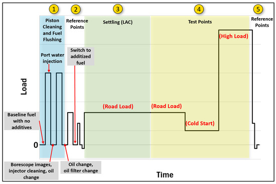 The test procedure for the second and third test days, which involved running the additive at the 1×TT and 3×TT concentrations, respectively, is shown in Figure 5. The major difference in this procedure is that it does not involve the piston cleaning and fuel flushing phase. Every subsequent test day involved running at a higher treat rate of the same additive for which cleaning using water injection and oil changes were not required, as there was no chance of additive cross-contamination. The remainder of the procedure for running 1×TT and 3×TT was the same as running LAC.