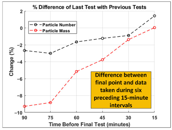 To define when emissions were considered ‘settled’, a threshold of ±10% variation was applied. Specifically, the PM and PN values in the most recent 15 min interval had to remain within 10% of the values from each of the preceding six 15 min intervals (i.e., 90 min of stable emissions). This approach is illustrated in Figure 6, which plots the percent difference in the final data point against earlier intervals. When this variation stayed within the 10% range for both PM and PN metrics, the emissions were deemed stable, and steady state conditions were confirmed. The 10% value was based on variability in the observed data. The important consideration was to apply the same criteria to all tests for fair comparison. Additional details regarding the settling period are provided in Appendix A.