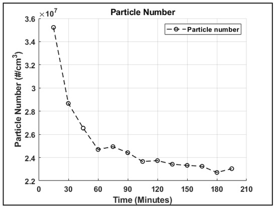 The threshold for the settling period was 6 h. In the case of a particular test, if the additive did not meet the settling criteria within 6 h, the engine running was transitioned to the cold start operating condition without the settling criteria being met. This approach was adopted to maintain uniformity in the testing by completing each test on the same day. Additionally, it was recognized that for certain additive concentrations, PM-PN emissions may not settle at all. This could be due to fuel–additive interactions, which can lead to an ongoing cycle of deposit buildup and cleanup. Figure 7 shows the variation in particle number, and Figure 8 shows the particulate mass emissions for Additive 2 for the LAC treat rate. The settling time for this test was 195 min. Each data point represents the time at which the data block stopped recording. For example, the data point at 15 min represents the average data from 0 to 15 min.