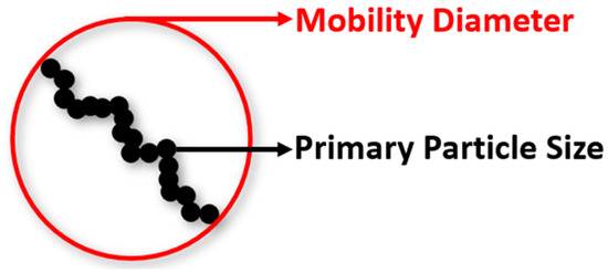 The EEPS estimates the particulate mass based on the particle number, as previously mentioned. The lower-diameter particles have the same density as carbon. When these small spherical particles aggregate together, the resulting shape is not necessarily a sphere, as shown in Figure 10. Park et al. [23] demonstrated this by examining particulate matter through a transmission electron microscope. The EEPS, however, assigns the particle diameter based on the mobility diameter. This leads to an overestimation of the mass contribution of higher diameter particles and an underestimation of the mass contribution of lower diameter particles.