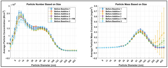 The EEPS was checked for repeatability by running the road load condition for 5 min using unadditized fuel before the start of every baseline or additized run. This was performed after the piston cleaning with water injection, which ensured the uniformity of conditions during the reference checks. The total PM-PN emissions for the EEPS reference checks are shown in Figure 11. The same data as a function of diameter is shown in Figure 12.