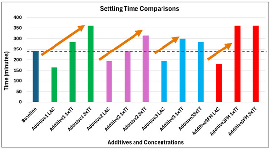 - Settling time: The majority of tests achieved emissions stabilization within 6 h of running at road load. The settling time increased with additive concentration. The additive with the friction modifier was the only one for which the PM-PN emissions did not settle for a 1×TT treat rate.