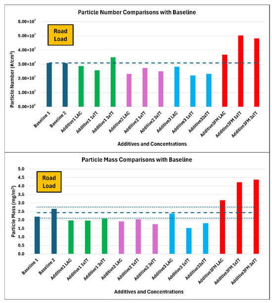 - Road Load: At the road load condition, the three deposit control additives (DCAs) without friction modifiers reduced particulate mass (PM) and particle number (PN) emissions compared to the baseline, but the effect varied nonlinearly with concentration and additive chemistry. The inclusion of the friction modifier caused a substantial increase in the PM-PN emissions for all treat rates. The increase in particle number at the LAC, 1×TT, and 3×TT concentrations of the Additive 3 plus Friction Modifier combination was 19%, 63%, and 56%, respectively, while the increase in particulate matter was 30%, 74%, and 80%, respectively.