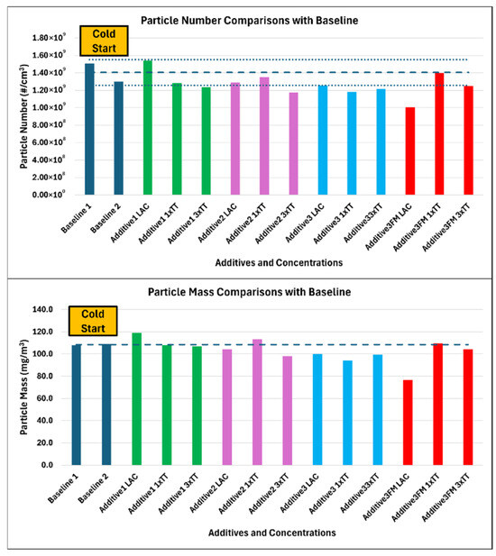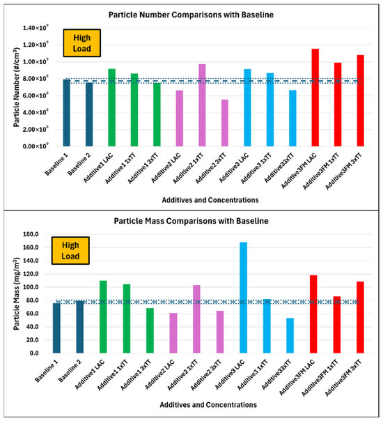 - High Load: No specific trend was observed at the high load condition. For all additives without the FM, the 3×TT treatment rate had lower emissions as compared to the baseline. The Additive 3 plus Friction Modifier combination showed an increase in the PM-PN emissions at the high load condition, with the LAC treat rate showing the highest increase (49% PN emissions, 52% PM emissions).
