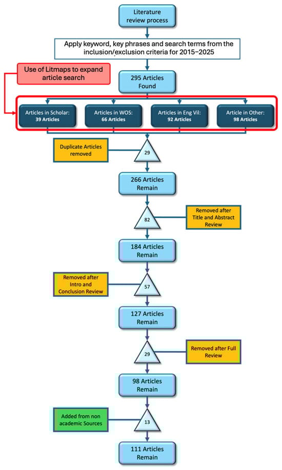 The initial literature pool was identified through Scopus, Web of Science, and Google Scholar, using combinations of terms such as “inland waterway transport,” “zero-emission vessels,” “alternative fuels,” “shore power,” “hydrogen bunkering,” and “electric propulsion.” Boolean operators and iterative queries were applied to these searches to broaden the results. Supplementary sources were identified using www.Litmaps.com, an AI literature researching tool, to trace citation networks and capture studies outside narrow keyword searches.