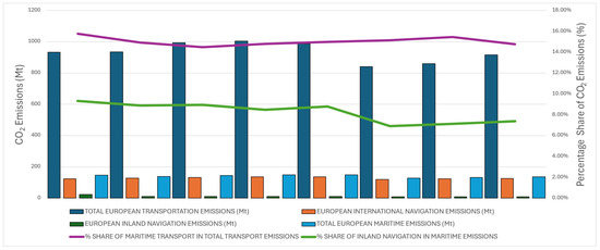 As a result, the sector contributes significant levels of carbon dioxide (CO2), nitrogen oxides (NOx), and particulate matter (PM) to the maritime sector’s overall emissions, particularly in regions where IWWs intersect with urban environments [6,11,17,18]. Figure 2 illustrates this in context: while IWW navigation contributes only a small share of European transport emissions, it forms a substantial portion of maritime emissions. These proportional contributions clarify IWT’s relative efficiency compared to road freight but also its critical role within maritime decarbonisation strategies.