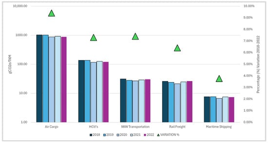 The average emissions of transportation modes across the EU 27 countries between 2018 and 2022 gCO2e/TKM alongside the variation in percentage for each mode during the same period. Data taken from [2,11,20,21].