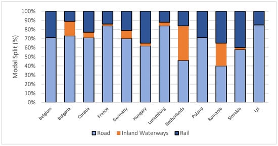 Modal share of freight transportation across selected European states, highlighting the relative contribution of IWW compared to road and rail. Data taken from [1,2,11,16].