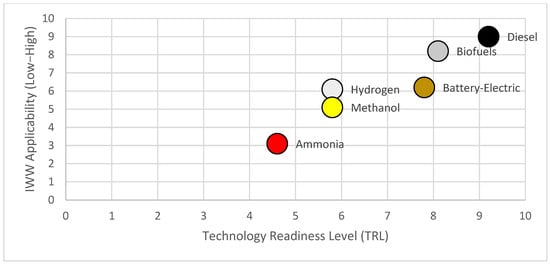 Technology readiness vs. inland waterway applicability for alternative fuels and propulsion systems. Data taken from [6,11,18].