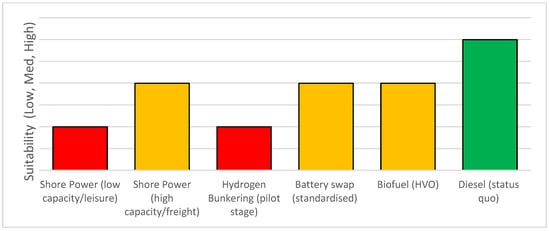 Similarly, ref. [26] emphasises that while battery–electric systems have demonstrated high operational efficiency and zero ‘tank to wake’ emissions, their low energy density necessitates frequent charging or a reduced vessel range, or worse, still both, unless oversized battery banks are employed [26,36,43]. This introduces trade-offs not just in weight and displacement, but also in usable payload and vessel stability. Moreover, ref. [26] also warns that these trade-offs are route dependent. Vessels operating on short shuttle services, such as cross-river ferries, with known shore power access points may be well-suited to battery operation, but long-haul or irregular routes face significant limitations without dedicated frequent shore power charging stations or some kind of dynamic charging solution. The lack of such options will impose restrictions on voyage scheduling and disrupt turnaround time, which could impact operational viability.