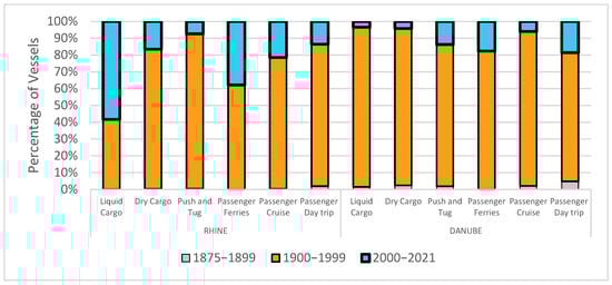 IWT is often portrayed as an environmentally efficient freight mode. As shown in Table 2, IWT emits significantly fewer GHG emissions per TKM than road freight, and are broadly comparable to rail [14,15]. This perception masks the sectors near-total reliance on fossil fuels for propulsion and all onboard power systems. The majority of vessels in operation today across the European IWWs are not only diesel-powered but rely on ageing engine technologies that pre-date modern emissions standards and lack basic after-treatment systems. These legacy systems are examined further in Section 6, where the age profile and heterogeneity of the fleet are shown to be a critical barrier for infrastructure compatibility.