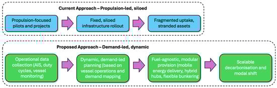 This creates a bottleneck that undermines the wider decarbonisation agenda. While national and EU strategies promote modal shift, little attention has been paid to ensuring that the IWT sector can actually support zero-emission operations at scale [4,5]. Shifting freight from diesel trucks to diesel barges is simply emissions displacement. To realise the climate benefits of IWT, the sector needs to be supported by a coherent, route-adaptable energy delivery system that matches the flexibility and variability of vessel operations; the strategic implications of this requirement are synthesised in Section 7. The misalignment between propulsion technology and the energy provision required to support it is a recurring theme throughout the literature. However, it remains under-analysed and poorly addressed in current infrastructure and policy frameworks.