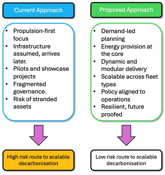 These findings point to a fundamental issue: decarbonising IWT is not simply a matter of fuel, propulsion or vessel choice. It involves confronting systemic challenges across energy provision, regulatory alignment, asset lifecycle management, and operational logistics. Without this broader systems view, there is a risk that IWT will remain trapped in a paradox—widely endorsed as a clean freight alternative, yet structurally unequipped to deliver those benefits at scale, and the longer delays persist, the more exposed IWT will become as other transport sectors demonstrate faster decarbonization progress. This disconnect is likely to deepen as other freight modes such as electric trucking or hydrogen rail, for example, continue to receive targeted decarbonisation support and outpace IWT in demonstratable emissions reductions [32]. Section 7 returns to this systemic perspective, arguing that only demand-led, provision-focused strategies can close these gaps.