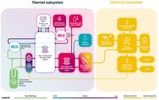 The WEDISTRICT project considered the combination of geothermal-photovoltaic hybridized technology to produce the required thermal and electrical energy using only renewable sources. This system ensures the proper heating and cooling of the TB, as well as covering its DHW and electricity demand. Figure 1 represents the complete demo-site block diagram of the technologies installed. The hybrid system is composed of a thermal subsystem, producing thermal energy using geothermal heat pumps, and an electrical subsystem, producing electrical energy using PV Panels.