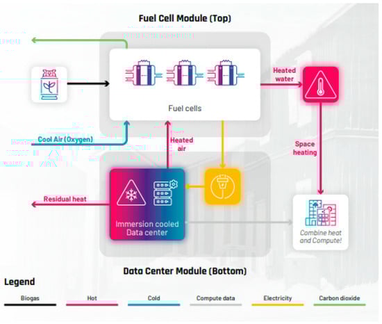 Then, the technologies proposed combine two modules. The first one is the data center module (DC module) where the DC servers are immersed in a dielectric liquid for direct heat transfer by liquid cooling technology. The excess heat is transferred to preheat the incoming air into the second module, which is the solid-oxide fuel cell module (FC module), where nine biogas SOFCs are located. SOFC generates thermal and electrical energy. The thermal energy produced feeds the existing DH network. The electrical energy produced feeds 90% of the DC module consumption; the 10% left needed to operate is taken from the grid, according to the demo-site performance data. Figure 2 represents the demo-site process diagram of the technologies installed.