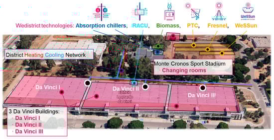 This demo site is located at the Rabanales Campus of the Universidad de Córdoba (UCO). Specifically, in the baseline scenario, the energy demand of two buildings (the changing rooms of Monte Cronos Sports stadium and the Da Vinci Building zones I, II and III) at the Rabales Campus was covered by a district heating (DH) network, which provided energy from six heat pumps and a gasoil boiler.