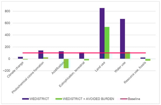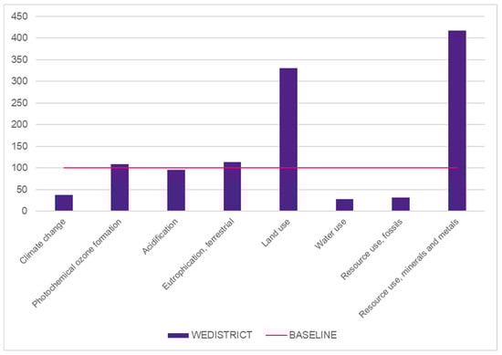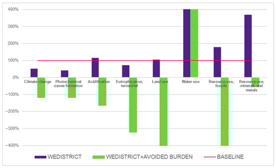 Table 7 presents the results for both the baseline and WEDISTRICT scenarios, while Figure 4 illustrates these results in relative terms, with the baseline scenario normalized to 100%. Comparing the WEDISTRICT scenario against the baseline reveals three distinct trends. The first trend shows environmental improvement in the categories of climate change and fossil resource use. The second trend indicates higher environmental impacts in the WEDISTRICT scenario for photochemical ozone formation, water use, land use and mineral and metal resource use. The third trend, observed for terrestrial eutrophication and acidification, shows similar impacts in both scenarios, suggesting that these results are inconclusive and require careful interpretation.
