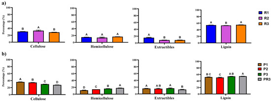 Anaerobic digestion process of lignocellulosic materials. Compositional analysis of Reynoutria (a) and Phragmites (b). Legend: Percentages of extractives, cellulose, hemicellulose, and lignin in Reynoutria plants from first harvest (R1), second harvest (R2), and third harvest (R3) and in Phragmites (b) plants from three harvests (P1. P2. P3) and root parts (PR3). Values represent mean percentages ± standard deviation. The different letters indicate that results are statistically significantly different (p < 0.05).