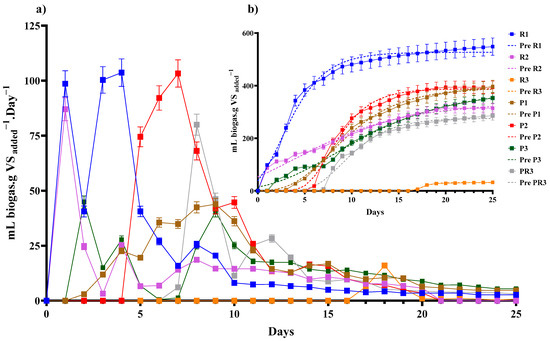 To assess the biogas accumulation and performance during AD, a modified Gompertz model (Equation (5)) was employed for nonlinear regressions analysis, enabling the generation of representative simulations and predictions.