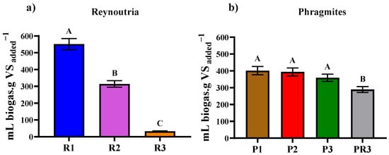 Cumulative biogas production from (a) Reynoutria (R) and (b) Phragmites (P) (b) over different harvest periods. Each data point represents the mean value, with error bars indicating the standard deviation. Legend: Reynoutria plants from first harvest (R1), second harvest (R2), and third harvest (R3) and in Phragmites (b) plants from three harvests (P1. P2. P3) and root parts (PR3). Values represent mean percentages ± standard deviation. The different letters indicate that results are statistically significantly different (p < 0.05).