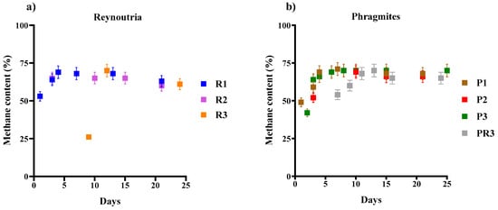 Methane content of biogas generated in thermophilic anaerobic digestion of (a) Reynoutria and (b) Phragmites. Legend: Reynoutria plants from first harvest (R1), second harvest (R2) and third harvest (R3) and in Phragmites (b) plants from three harvests (P1. P2. P3) and root parts (PR3). Values represent mean percentages ± standard deviation.