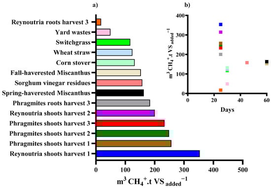 The AD of Phragmites revealed the following methane content: for stems and leaves from the first harvest, methane content ranged from 49% to 71%, with an average of 64.00%. For the second harvest, biogas methane content ranged from 52% to 69% (average 63.25%). Shoots from the third harvest exhibited methane content ranging from 42% to 70%, with an average of 65.13%. Root parts produced biogas with a methane content ranging from 54% to 70% (average 63.67%) (Figure 4b). Detailed values for both species are provided in Tables S3 and S4 (Supplementary Materials).