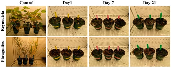 To assess the innocuity of Reynoutria and Phragmite digestates from three distinct harvest periods, greenhouse germination trials were conducted. The germination experiment involved a series of containers, each containing 1 L of substrate (a 1-inch layer) mixed with either 300 mL of a digestate or a control. The control consisted of 300 mL of shredded biomass that had not undergone AD. Each treatment was repeated five times. The soil was kept at a consistent moisture level, and the greenhouse was kept at an average temperature of 20 °C, with a 14 h photoperiod [28].