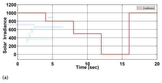 - Environmental and Load Conditions: Solar irradiance and ambient temperature were varied within the realistic range of 15 °C to 45 °C. Transient faults and disturbances were applied during simulation windows of 5–8 s and 10–13 s to validate robustness under fluctuating conditions.